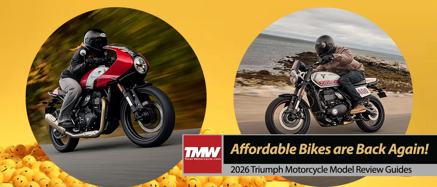 Oh, happy days are here again motorcycle fans! Total Motorcycle has been calling for affordable motorcycles for decades and we are seeing the return of fun, inexpensive bikes from Triumph now…Riders rejoice, it’s a good day! With the introduction of the new 2026 Triumph Tracker 400 $5995 and new 2026 Triumph Thruxton 400 $6295, it’s now 5 new <500cc’s you can buy and get excited owning.