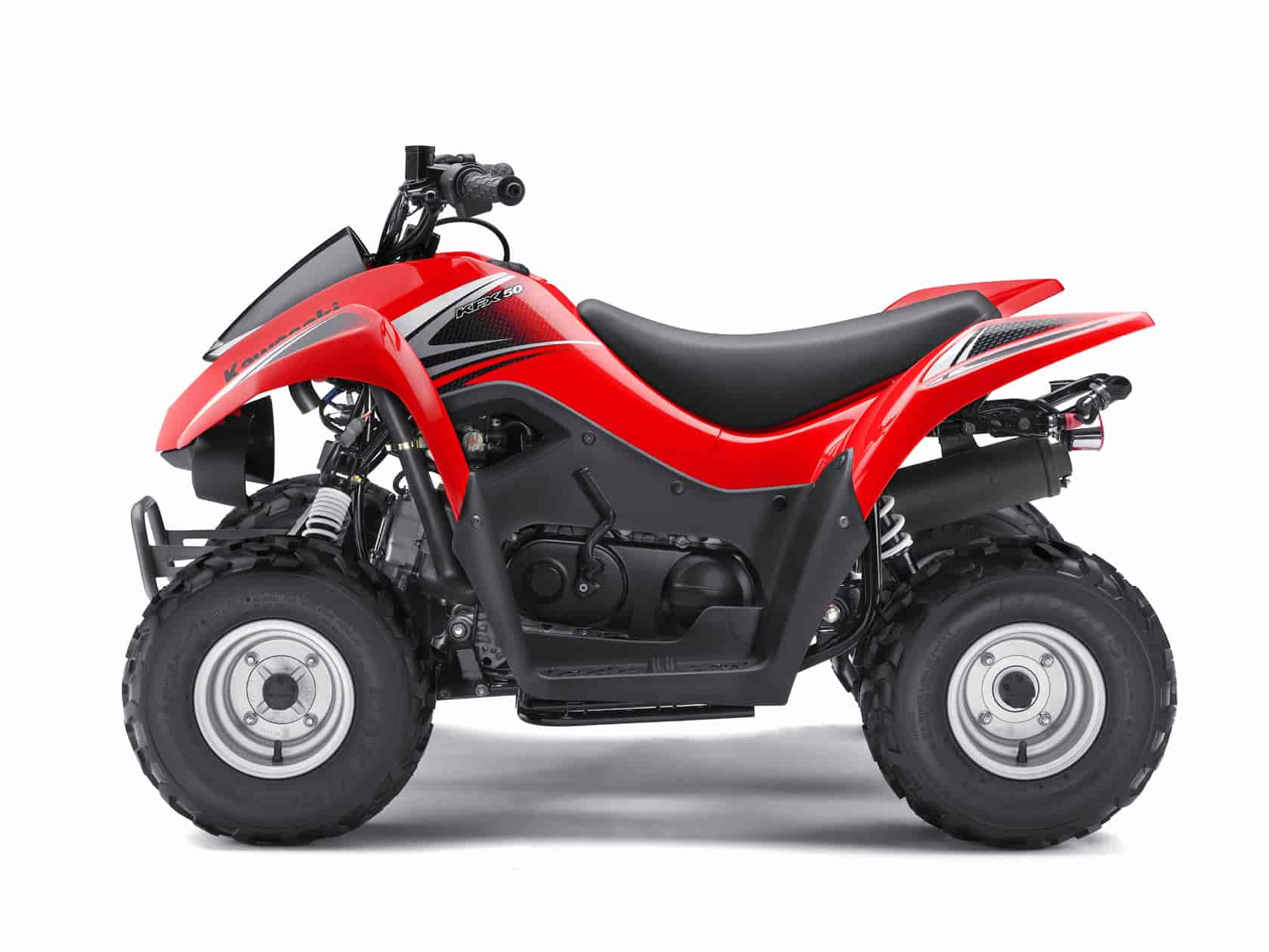 The Kawasaki KFX®50 is a great starting point for beginning ATV riders age six years and older. With its wide 27.6-inch stance, full floorboards and environmentally friendly air-cooled, four-stroke engine, the KFX50 delivers solid performance and stable handling to provide a good foundation for young learners.