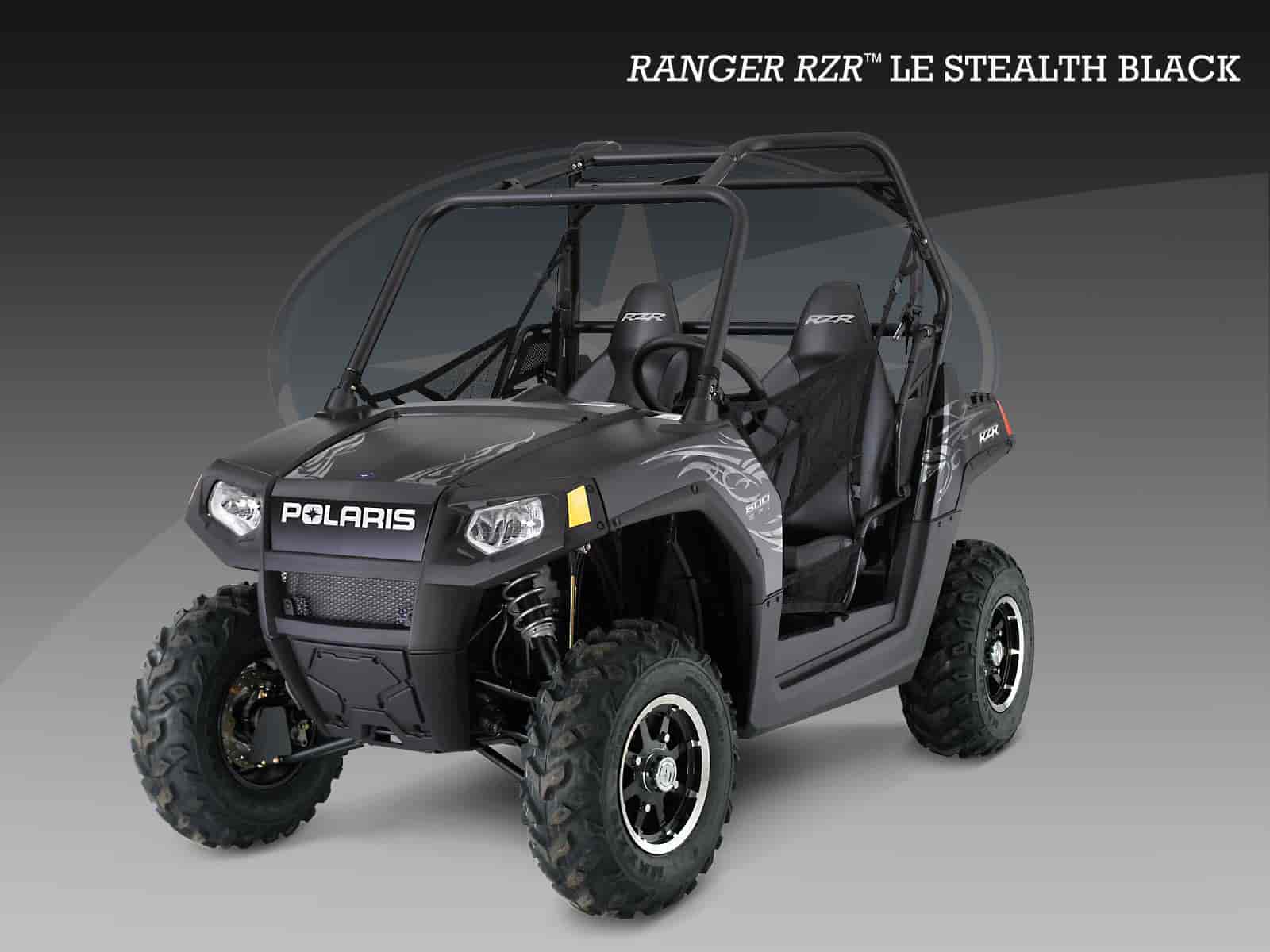 The 2010 Polaris RANGER RZR® Stealth Black LE Side-By-Side Vehicle with its narrow 50 in. width, is the only trail capable Side-By-Side Vehicle available today. This powerful vehicle dominates the competition with its agile patented low-center of gravity design and unbelievable 60 MPH (96.6 KPH) top speed. Its key RAZOR Sharp Performance® features include: