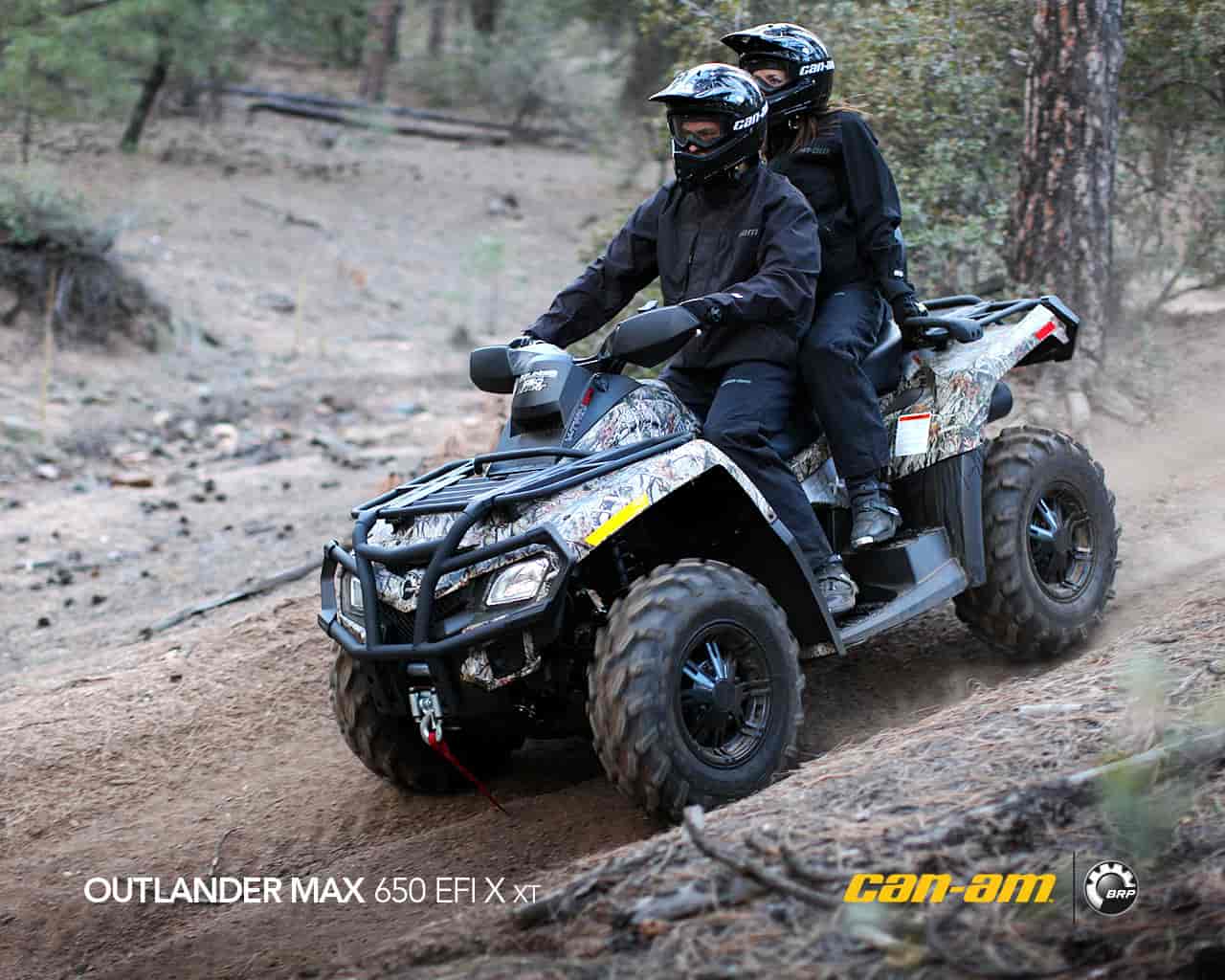With 7% more power than last year, the 60-hp 2011 Can-Am Outlander Max 650 XT is the most powerful bike in its class. Featuring a Convertible Rack/Seat System (CRS) that lets you to go from one-up to two-up in less than 30 seconds. Along with two-up features like a comfortable raised seat, sturdy ergonomic passenger handgrips and raised floorboards. Factor in its cast-aluminum wheels and you have a quad that’s only missing one thing: a trail.