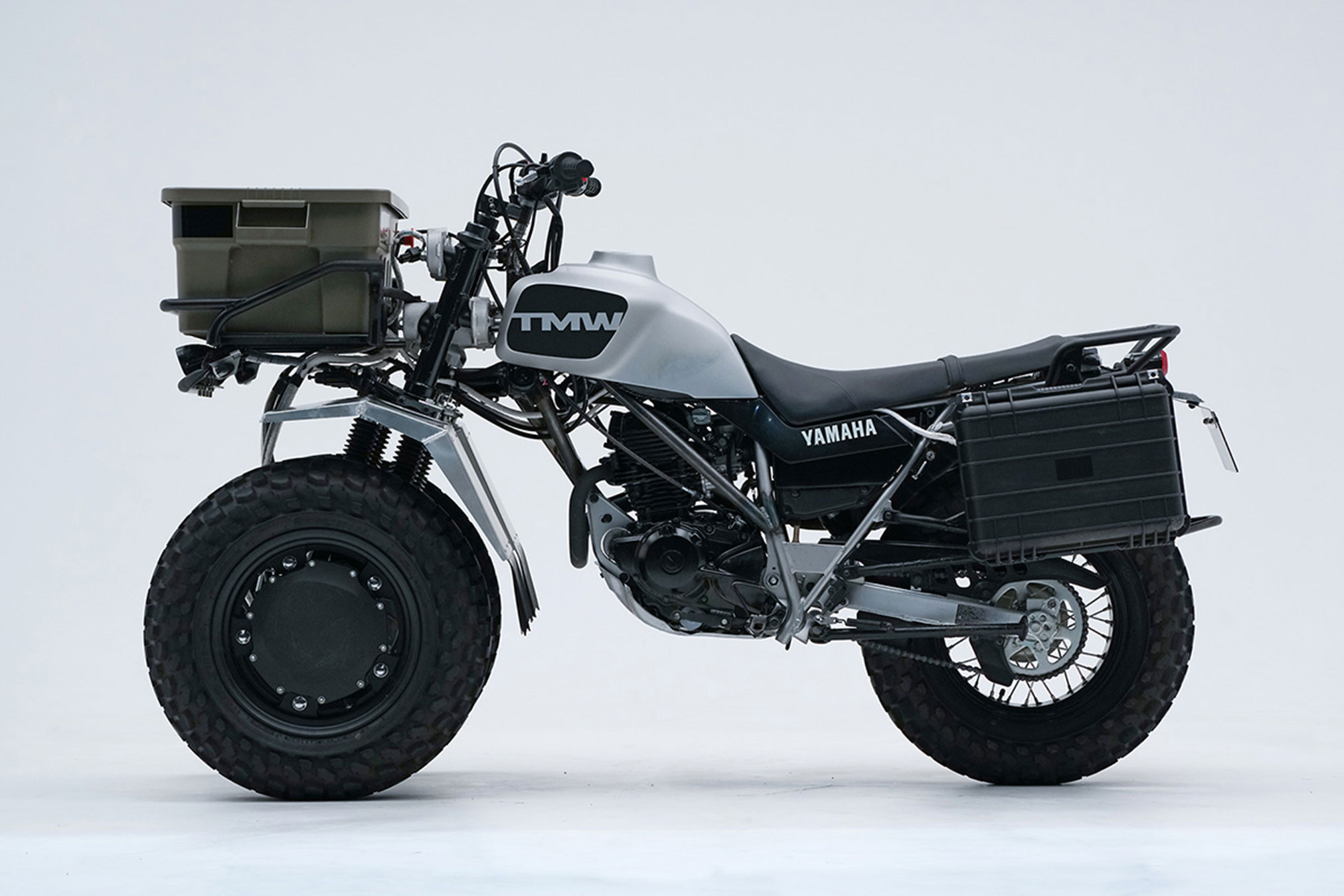 Conceived by volunteer project members from the Motorcycle Testing Division, the TMW is Yamaha Motor’s first off-road adventure Leaning Multi-Wheeler (LMW).* The front two wheels move independently and feature excellent adaptability for various surface conditions, and the LMW linkage enables the mounting of a large front carrier rack that stays level with the ground even when in a lean or on an incline. This ample luggage capacity further entices users to venture out for a ride. The TMW is also a hybrid; electric hub motors drive the two front wheels, while the rear wheel is driven by the engine.
