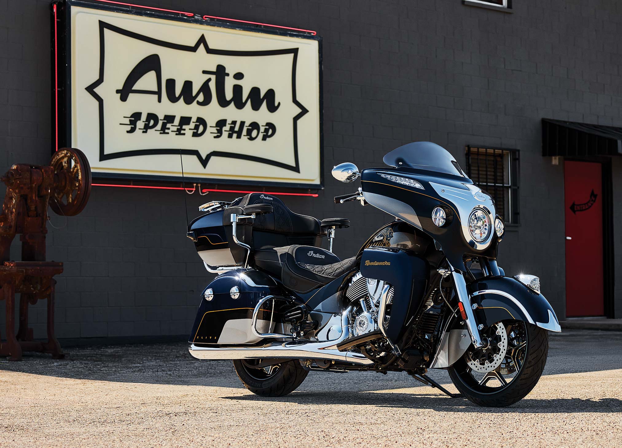 Honoring that past, the new Roadmaster Elite wears a tri-tone signature paint scheme, with premium candy finishes throughout. Indian Motorcycle Springfield Blue Candy, Black Candy, and