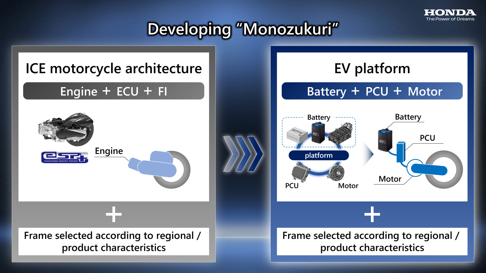 Based on its competitive “Monozukuri” (art of making things) know-how, amassed through the development and application of platforms for ICE-powered models, Honda will develop and apply electric motorcycle platforms that combine the three core components for electric vehicles – the battery, PCU and motor– with the motorcycle body.. By fulfilling customer needs with highly efficient Monozukuri, Honda will continue to offer the joy of mobility with affordably-priced electric motorcycle models.