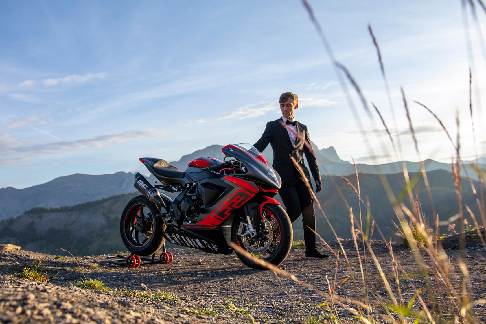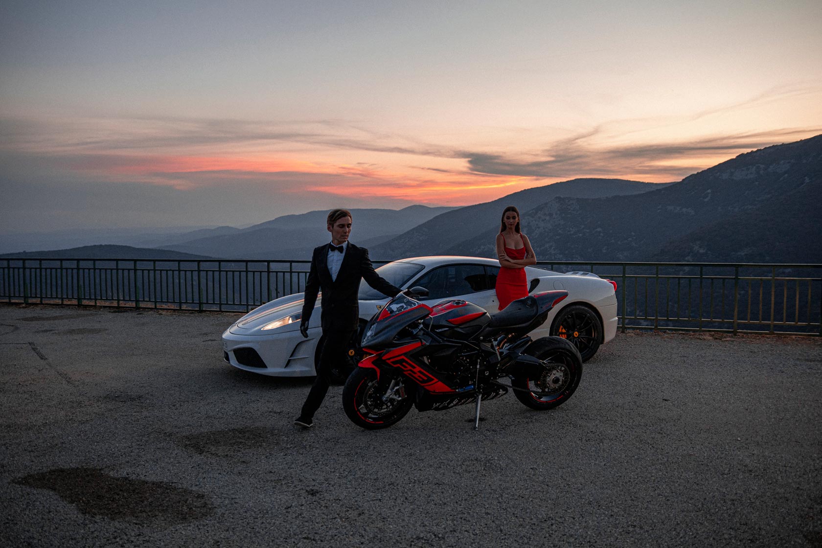Grab a martini, shaken, not stirred as Total Motorcycle brings you another blockbuster Inspiration Friday: Speed Danger Adrenaline & Femmes Fatales! No Netflix subscription required. Mr. Nogues is “Back in Black” with a vengeance in a new episode inspired by spy movie. While not staring Daniel Craig or Sean Connery, Mr. Nogues has all the excitement of a James Bond movie with “No Time to Die”! Speed Danger Adrenaline & Femmes Fatales shaken with dream landscapes, luxury cars, fast motorcycles and a zest of humor. And yes, Thibaut is wearing a black tie on a black MV Agusta.