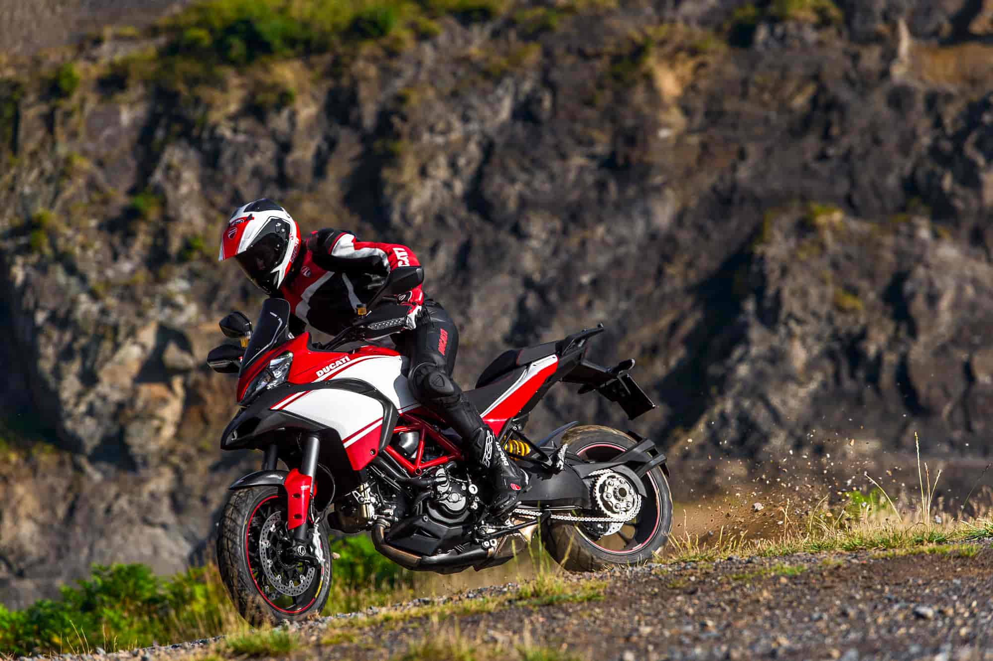 If adventure invites the Multistrada 1200 off the beaten track, it has the capability to take off-road routes in its stride. Agile and lightweight and with high, wide handlebars, serrated footrests and specially designed tyres, the Multistrada also features an Enduro Riding Mode which instantly produces a smooth 100hp engine, immediately dials-in an appropriate suspension setting on the ‘S’ versions and reconfigures DSS to provide appropriate active management. The DTC system is reduced to level two for minimal intervention and ABS to an off-road-oriented level one interaction for a low-grip terrain appropriate setting with “lift-up” detection deactivated and rear wheel ABS partially interrupted for controlled rear end drifting.