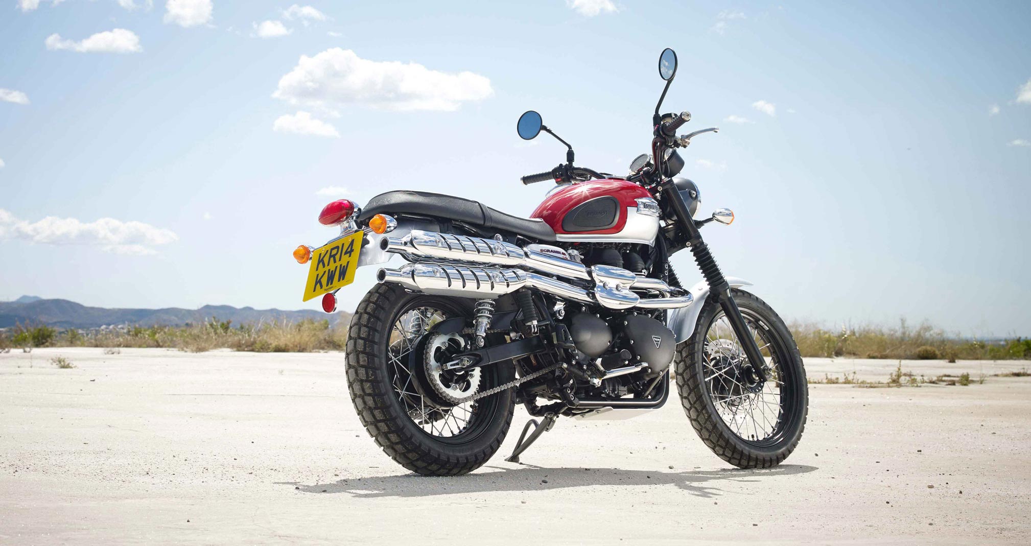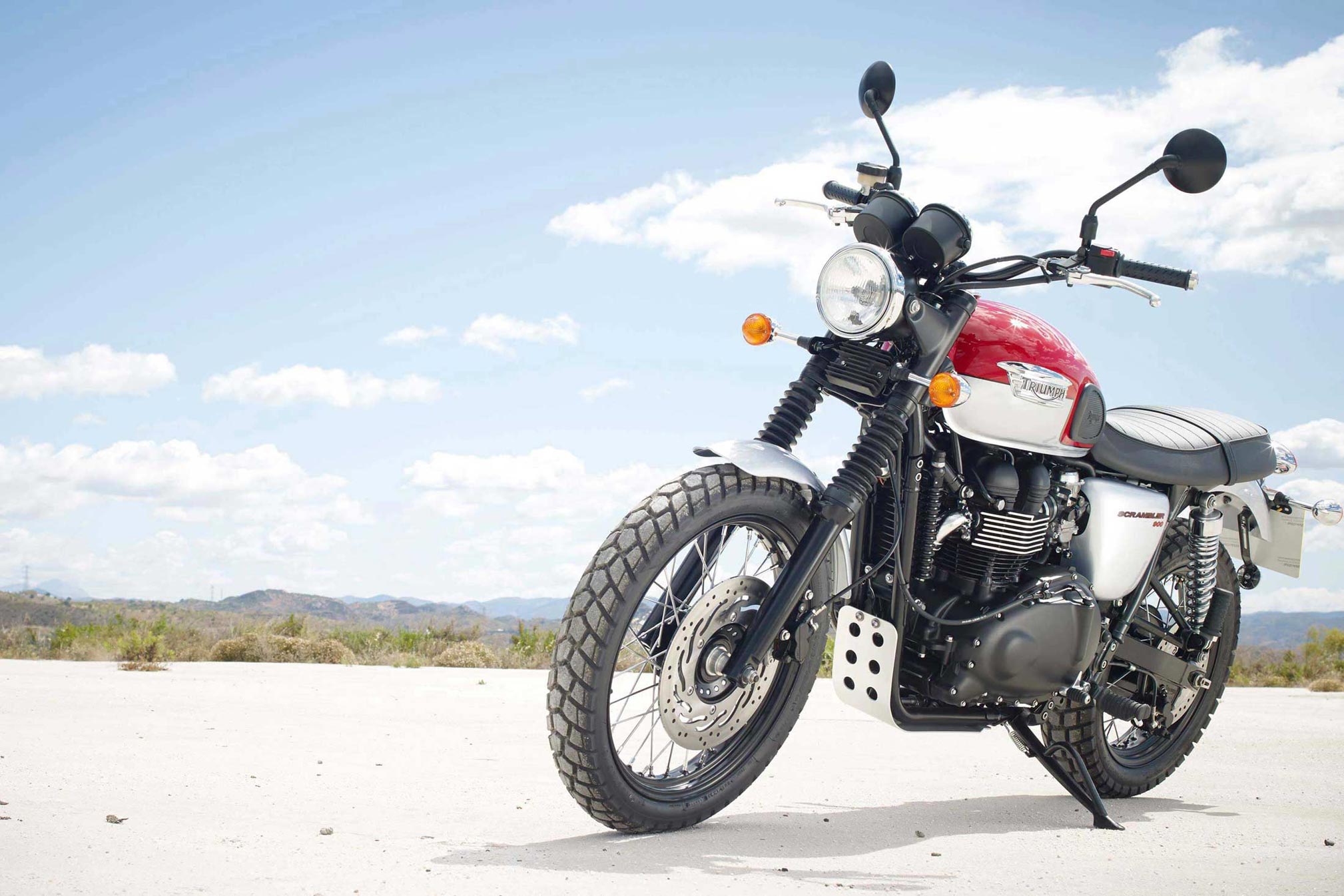 In the 1960s, far from civilisation and regular roads, stripped down desert bikes based on Triumph twins and fitted with high level exhausts, dirt bike tyres and suspension were being used for hard recreational fun and competition on tough terrain. The Scrambler takes its inspiration from these custom bikes.