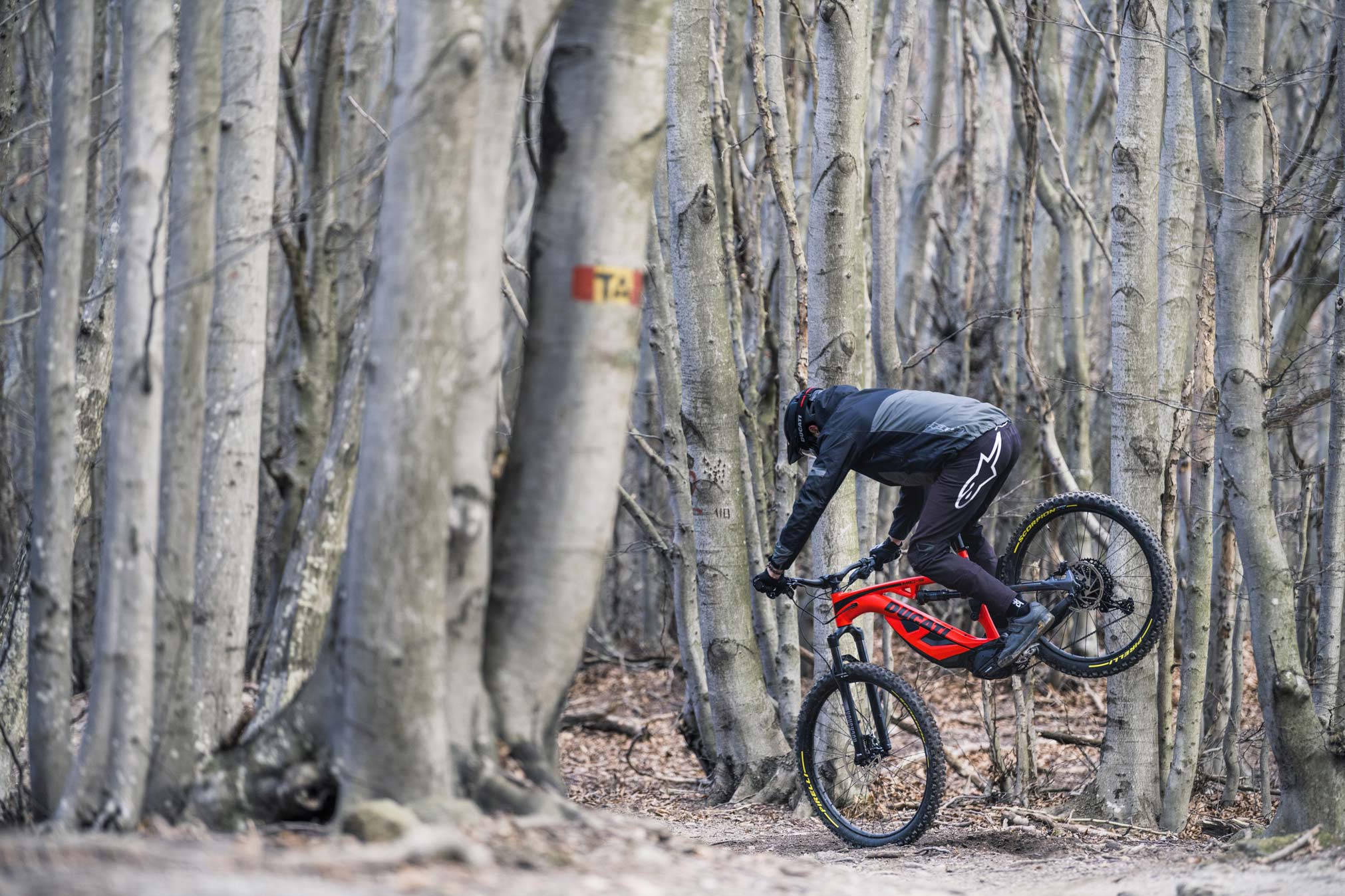 The Öhlins DH38 dual-plate motorcycle-style air fork (180 mm / 7 inch travel) and the Öhlins TTX spring shock absorber (170 mm / 6.7 inch travel) ensure incredible control of the vehicle downhill, while still maintaining great efficiency on uphill stretches. The 11-speed Shimano Di2 XT rear electronic shifter always provides fast and precise shifting, while the Magura MT7 brakes with 220 mm (8.7 inch) discs at the front and 203 mm (8 inch) at the rear are also of motorcycle derivation and are among the most powerful available on the market.