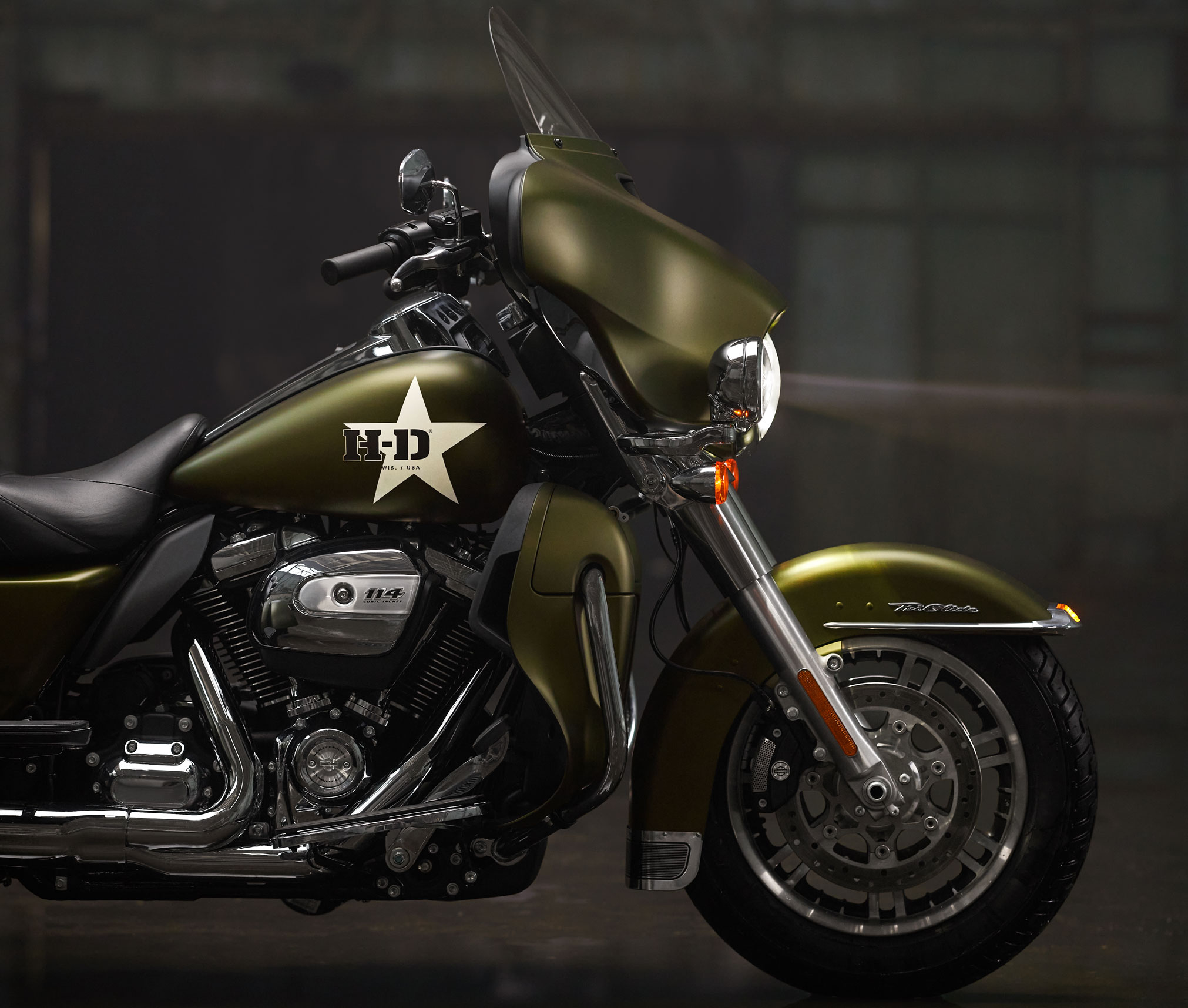The G.I. Enthusiast Collection is draped in stunning Mineral Green Denim Deluxe paint, an all-new color created specifically for this collection, and completed with service-inspired graphics. The G.I. Enthusiast Collection is available only as factory-installed for the Pan America 1250 Special and Tri Glide Ultra models, in limited quantities primarily for the U.S. market.