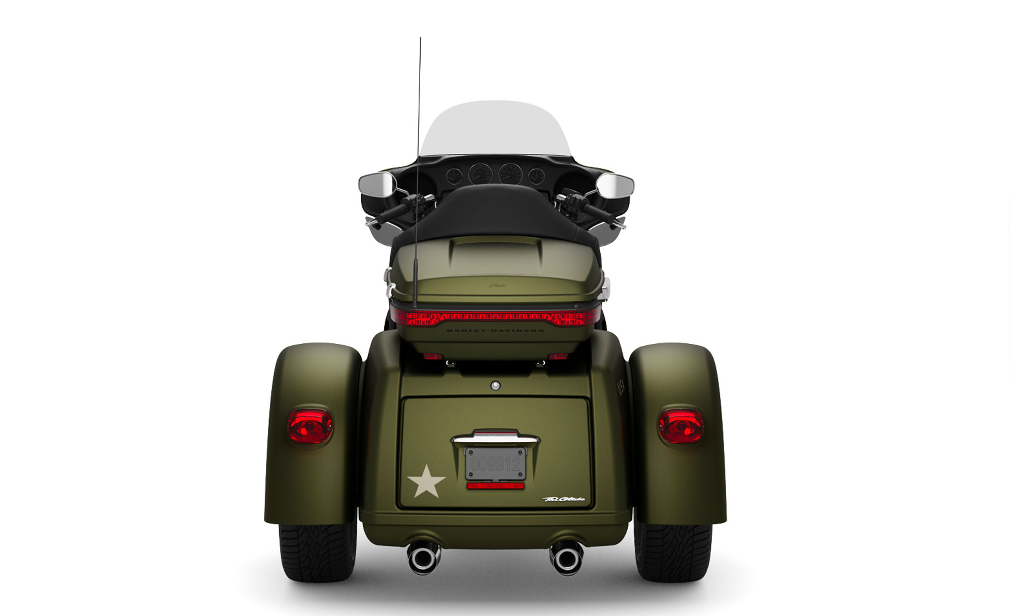 The Tri Glide Ultra G.I. is a modern-day military tribute to independence and personal expression, honoring Harley-Davidson’s community of riders who have and continue to serve in the US Armed Forces. Draped in stunning Mineral Green Denim Deluxe paint with military inspired graphics, this limited-edition model is for those who value the riding comfort, performance, and ample storage space that three wheels deliver for the long haul.