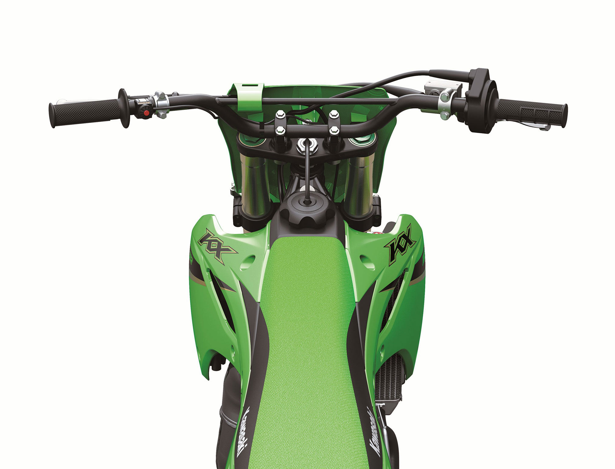 The bodywork of the KX112 follows along the lines of its bigger KX counterparts by forming a slim ergonomics package that facilitates rider movements and contributes to strong factory looks. The top of the fuel tank design is flat in order to facilitate sitting farther forward to weigh the front wheel when cornering and a slim, flat seat design makes it easier for riders to adjust their riding position. A new shroud design accommodates a wider range of young riders and makes it easier for taller riders to find a good fit on the bike. The minimalist side covers were made as small as possible and the seams between the shrouds, seat, and side covers are flush in order to allow the rider to move around on the bike with ease.
