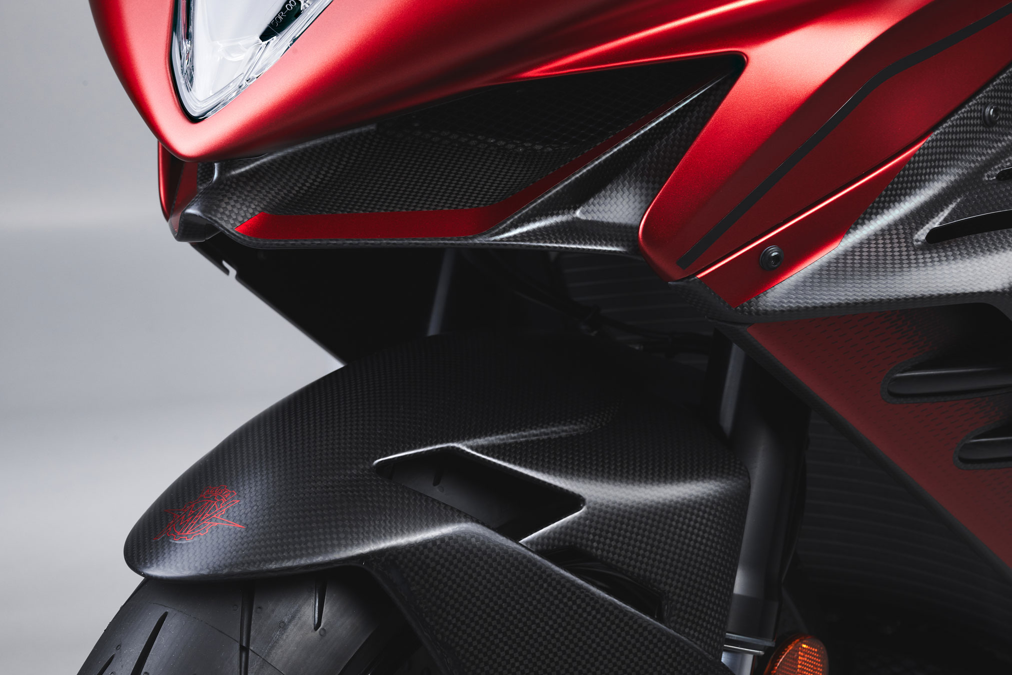 The F3 RR was the subject of a careful study in the wind tunnel, which led to the integration of some aerodynamic elements in the fairing. The objective? To improve performance and increase the efficiency of the engine. The appendages on the sides of the fairing are made of forged carbon fiber and are able to generate a load of 8 kg on the front end at a speed of 240 km/h.