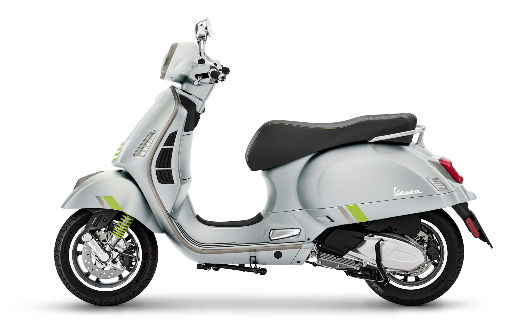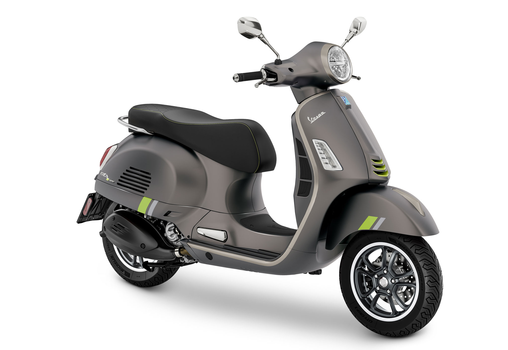 Vespa GTS SuperTech is the top-of-line Vespa GTS model, combining the ultimate sports attitude with cutting-edge technology. Aesthetically, it stands out for its distinctive satin chrome grey finishes, its graphite coloured wheel rims with diamond finish, and its matte shades with dedicated graphics, Grigio Ottimista, Blu Energico and Grigio Entusiasta. Other original contrasting elements include the steering cover decorations and the front shock spring painted in neon green. Even the saddle flaunts a “hi-tech” finish, with double upholstery and two-colour seams with neon green sections.