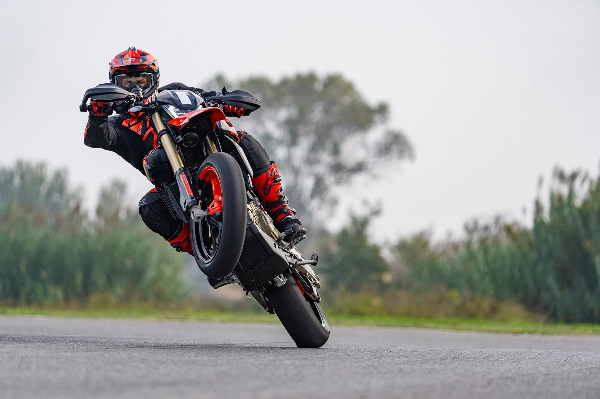 Dedicated software for the DWC system is available on the Hypermotard 698 Mono, reserved for use on the track, which in level 1-2 includes a wheelie assistance strategy called Wheelie Assist. This strategy assists the pilot in executing and maintaining an elongated wheelie (up to third gear in the case of gear changes with DQS or reaching the limiter on the individual gears), regulating the wheelie angle using the torque supplied. The system works best in combination with the DQS.