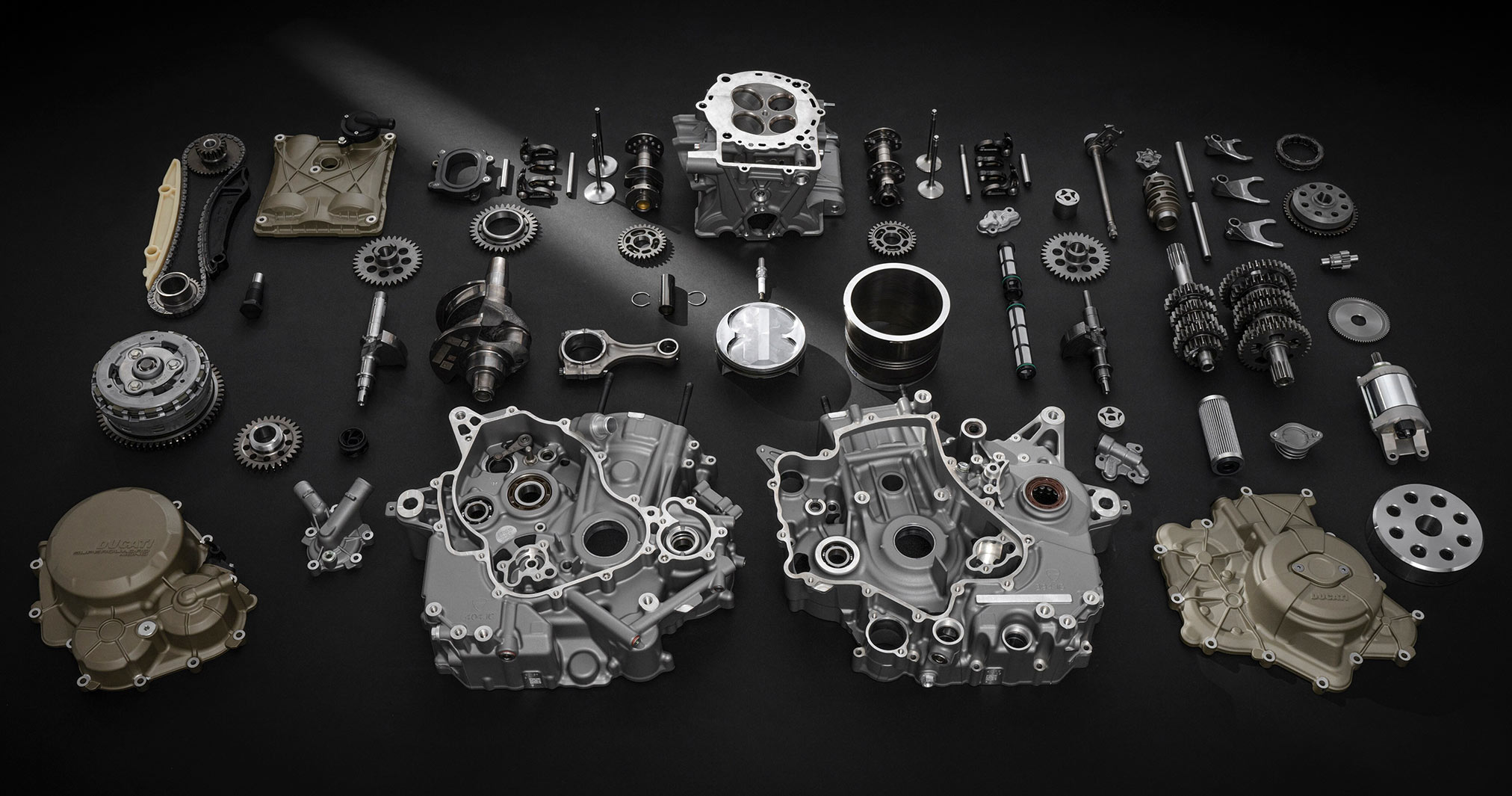 The Superquadro Mono derives from the twin-cylinder unit of the 1299 Panigale, inheriting features such as the 116 mm bore piston, the combustion chamber, the titanium inlet, steel exhaust valves, and Desmodromic valve system.