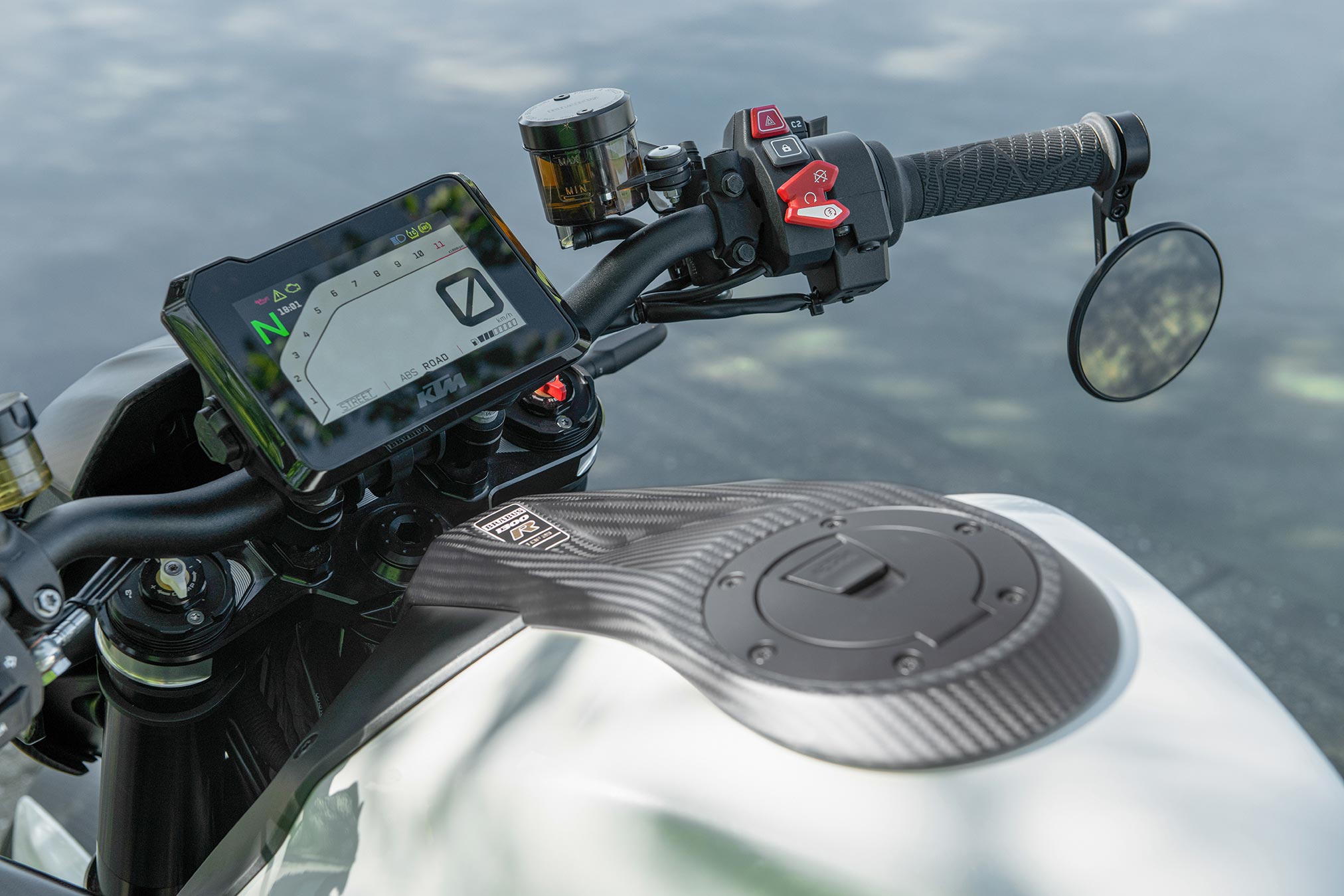 - Exclusive carbon package consisting of dash and connector covers, triangular covers for the rear side fairing as well as a cover for the single-sided swingarm