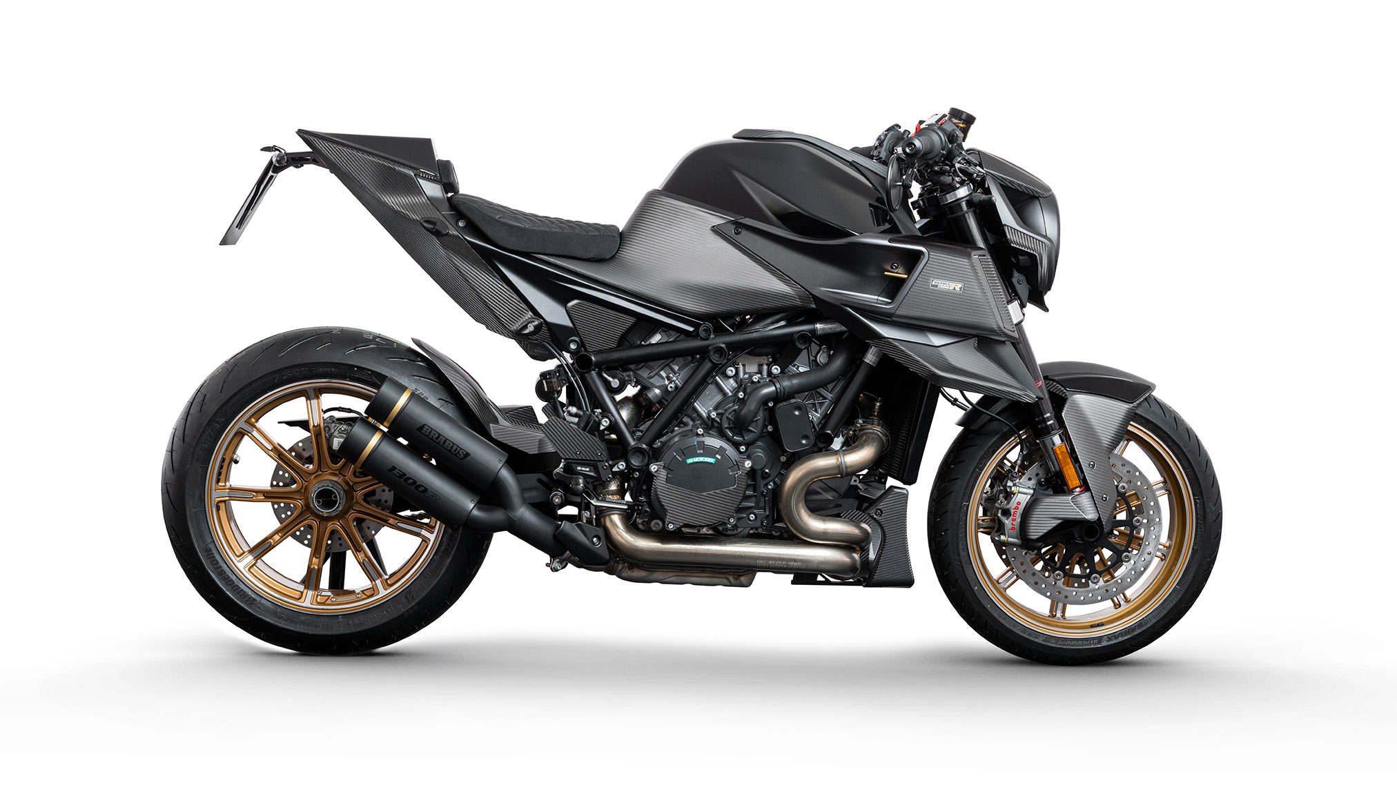The first BRABUS motorcycle was presented in February 2022. It came in two colors and was limited to 77 bikes of each. All 154 BRABUS 1300 R naked bikes were sold in less than two minutes. The second edition, the Edition 23 comprised two times 145 motorcycles or 290 bikes in all and sold out similarly quickly. The platform in both cases was provided by the KTM 1290 SUPER DUKE R EVO. The BRABUS series production is now coming to an end. The exclusive BRABUS 1300 R MASTERPIECE EDITION is available as a farewell to this fascinating hyper naked bike: a series of two times 25 elaborately refined motorcycles in the colors “Onyx Black” and “Diamond White,” which are given even more extravagant looks with select elements finished in the color “Frozen Gold”, and an even further expanded carbon package.