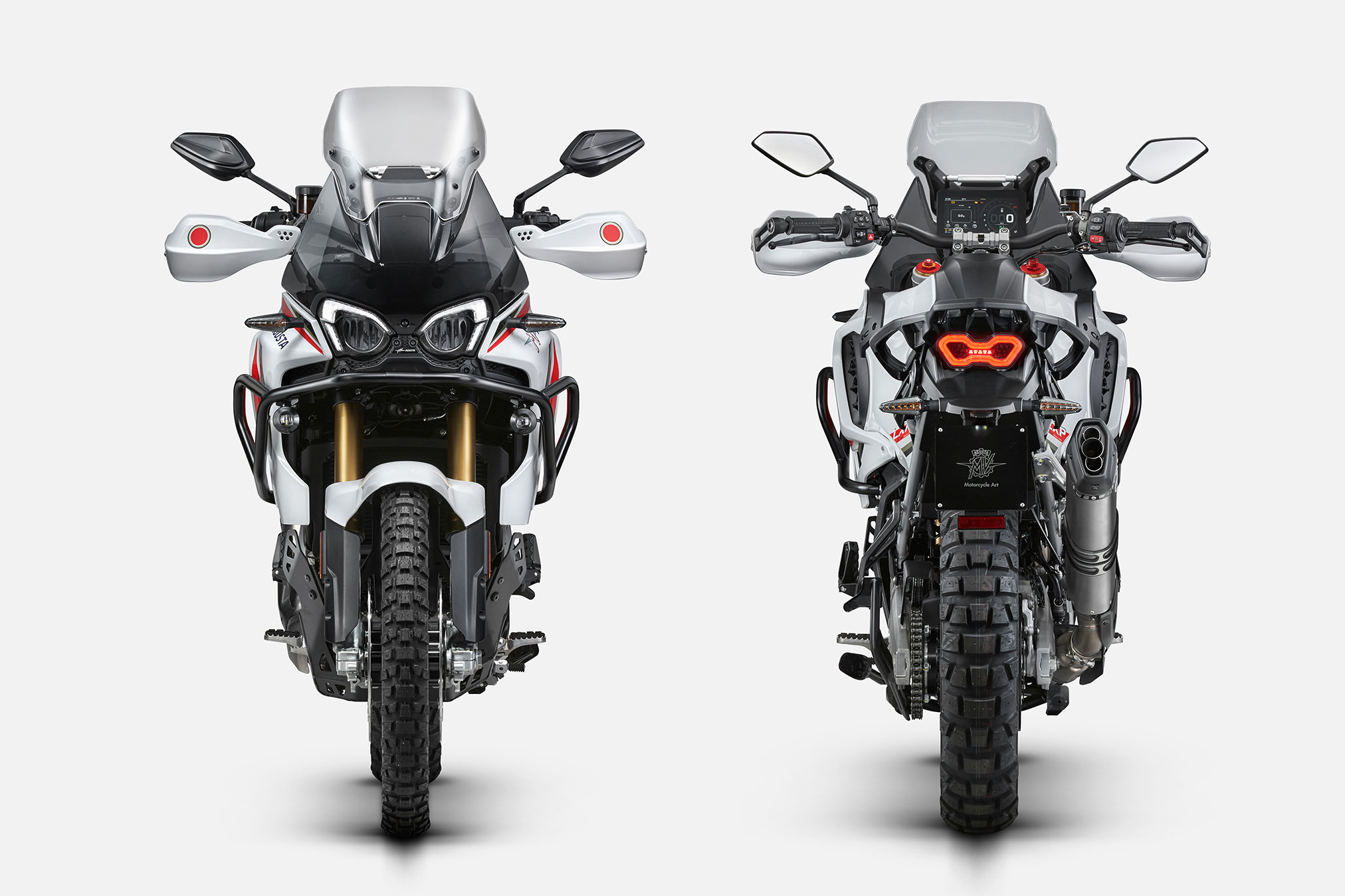 Full led tail light – Racing sump guard – Chassis crash bar – CNC wheel hubs – MV Ride app with turn by turn navigation system, engine and vehicle setup – Mobisat anti-theft system with geolocation – Aluminum side bags (32/39 l. – 8.45/10.30 gal.)