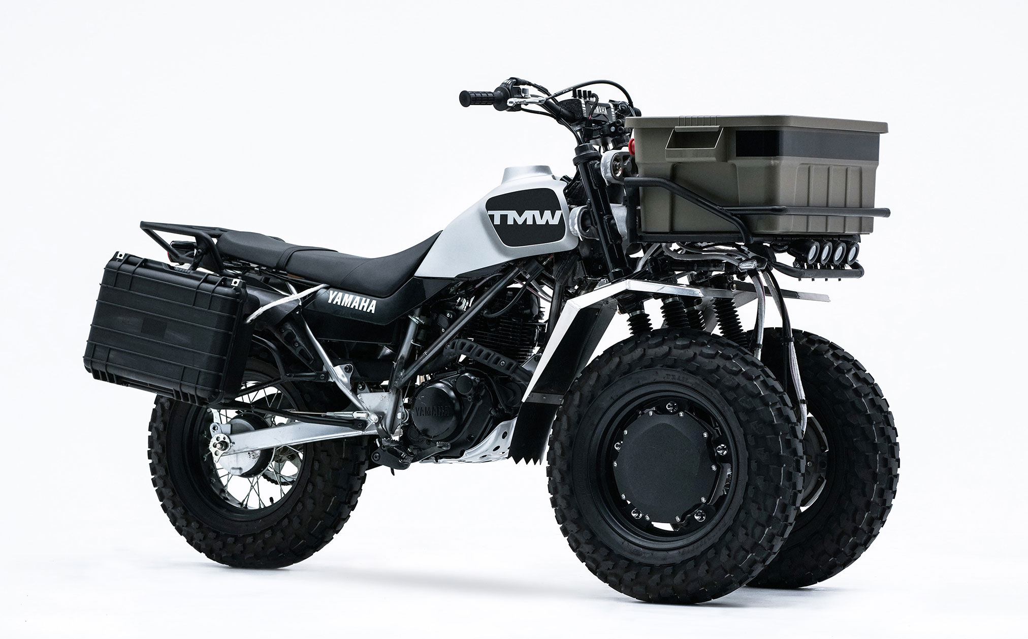 Conceived by volunteer project members from the Motorcycle Testing Division, the TMW is Yamaha Motor’s first off-road adventure Leaning Multi-Wheeler (LMW).* The front two wheels move independently and feature excellent adaptability for various surface conditions, and the LMW linkage enables the mounting of a large front carrier rack that stays level with the ground even when in a lean or on an incline. This ample luggage capacity further entices users to venture out for a ride. The TMW is also a hybrid; electric hub motors drive the two front wheels, while the rear wheel is driven by the engine.
