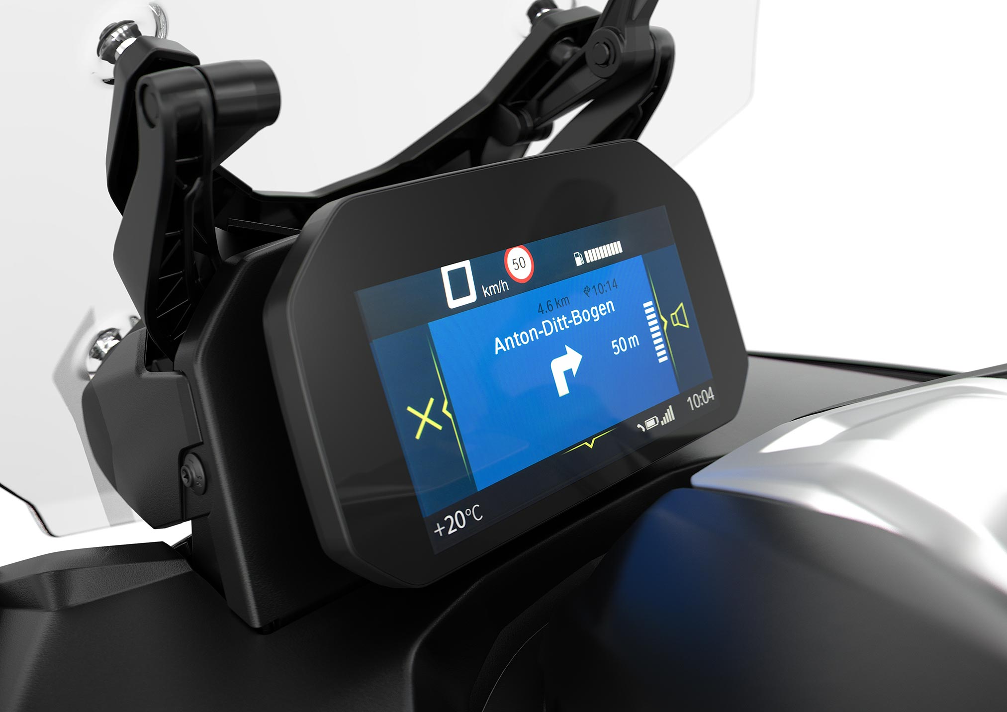 This basic navigation is particularly attractive for riders who want to comfortably handle everyday traffic or short trips without additional equipment. Navigation preparation with a holder for the BMW Motorrad Connected Ride Navigator or the BMW Motorrad Connected Ride Cradle is available as an accessory (not in conjunction with the 10.25” display).