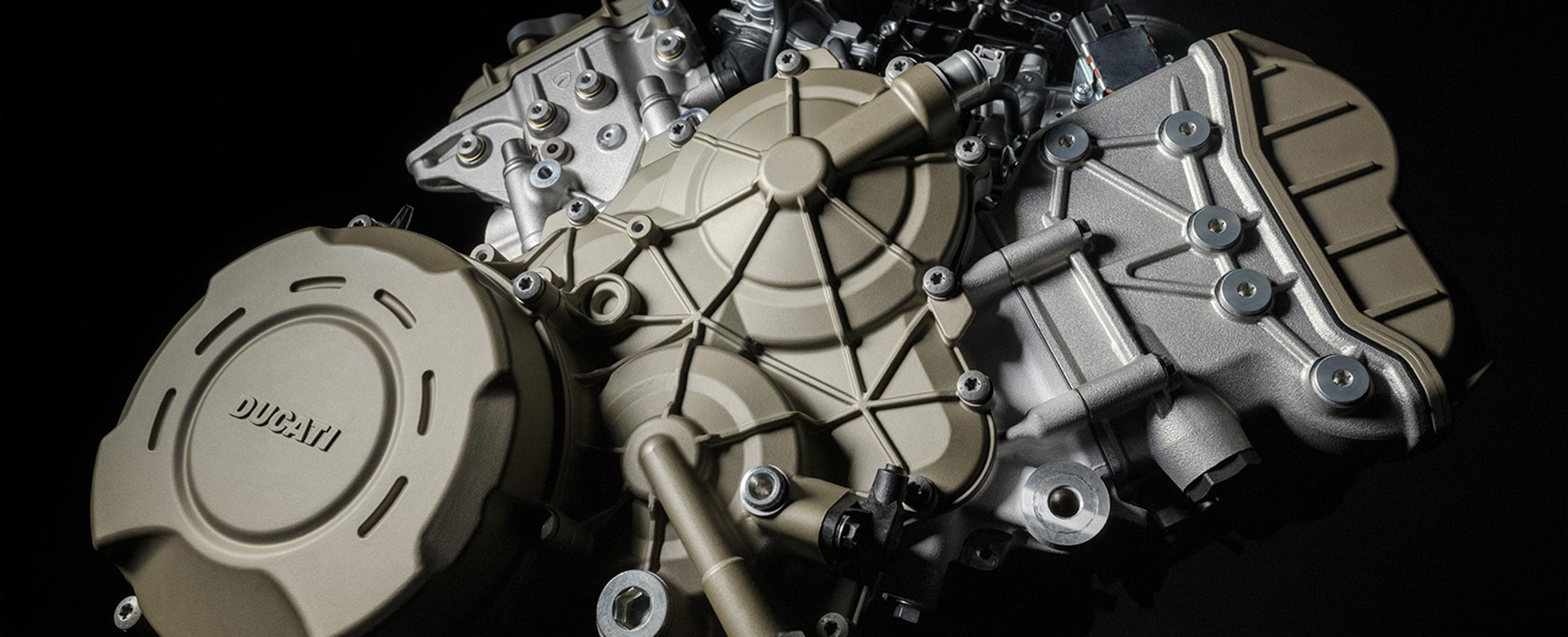 The Panigale V4, more powerful* and lighter than the previous model, was created to give enthusiasts unparalleled sensations. Its engine, the Desmosedici Stradale, is strictly derived from that of the Ducati MotoGP bike, with which it shares numerous technical solutions, starting with the architecture. It is a 90° V4 with desmodromic distribution, counter-rotating shaft and Twin Pulse timing, which gives the Panigale V4 a sound totally like that of the Desmosedici GP.