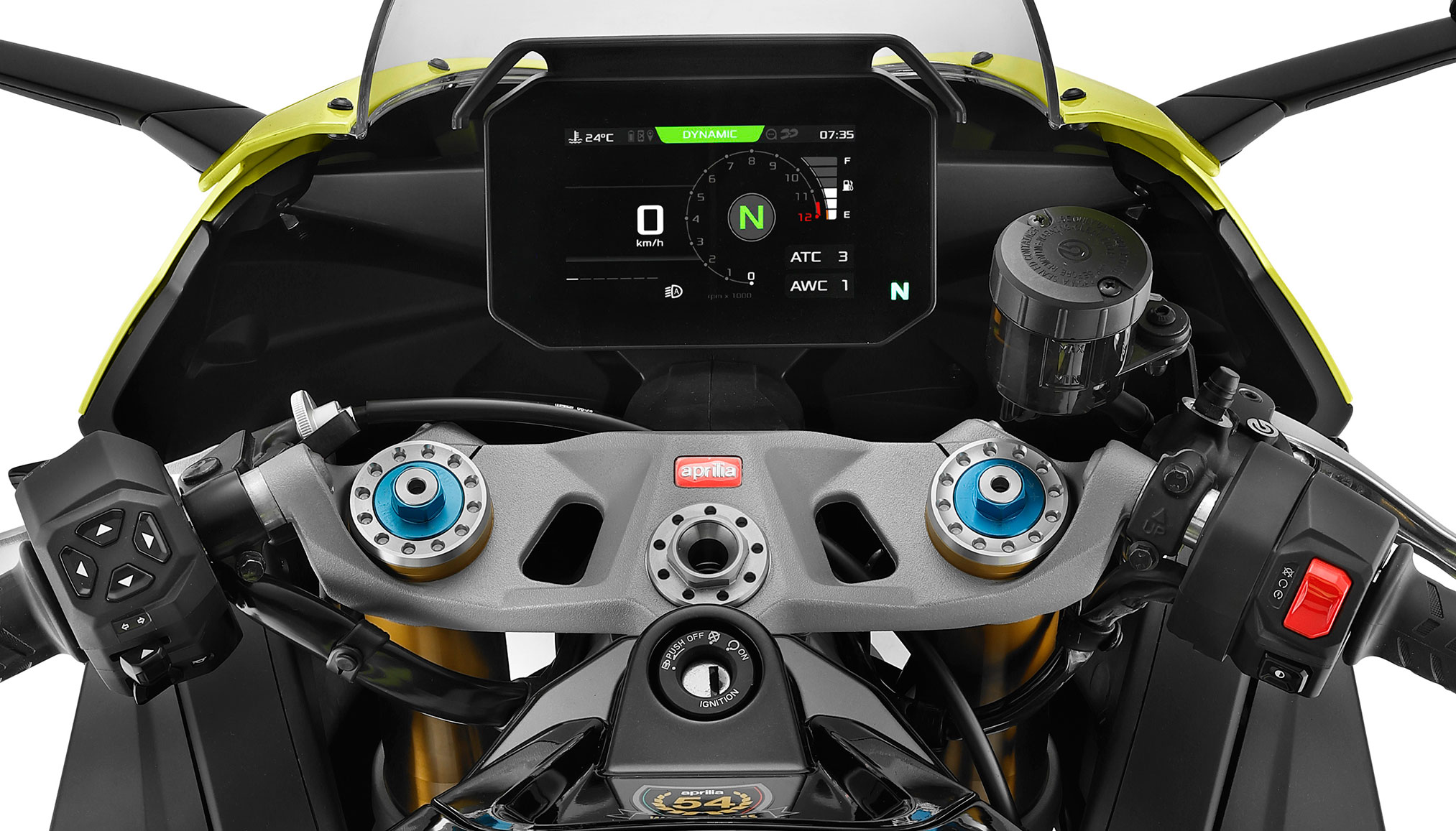 Full LED headlights and indicators with light signature. Bonded 5” TFT dashboard. Backlit switchcubes. APRC system with 6-axis inertial platform: Engine Maps (AEM), Engine Brake (AEB), Cornering ABS (3 maps and Rear Wheel Lift-up Mitigation), Traction Control (ATC), Wheelie Control (AWC), Aprilia Launch Control (ALC), 5 Riding Modes. Cruise Control (ACC). Aprilia Quick Shift (AQS). Metal Braided Brake Hoses