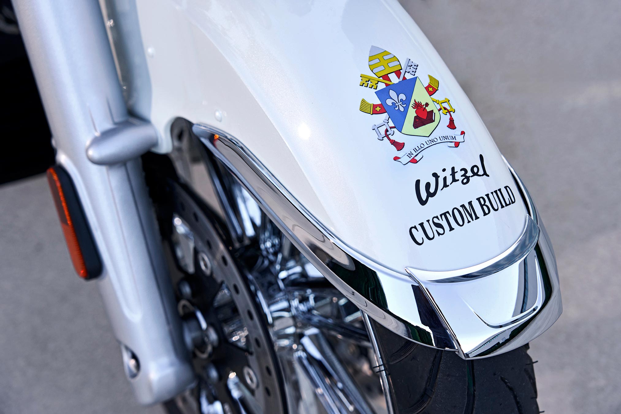 The R 18 Transcontinental was donated by BMW Motorrad Deutschland and refined by BMW Motorrad dealer Witzel. Witzel and Thomas Draxler, founder of JESUS-BIKER®, initiated the idea to create an absolutely unique bike for the pope for a good cause. It was painted mother-of-pearl white and the coat of arms of the Vatican was affixed to it, among other modifications.