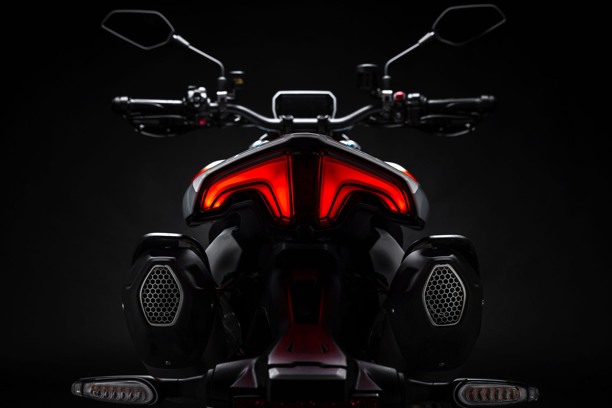 The front of the new Hypermotard V2 is robotic and modern, designed according to a stylistic language that strives for extreme simplicity: the double DRL, reminiscent of the Hyper’s iconic light signature, is inserted into a dark, glossy headlight, the protagonist of a sculpted, single-piece front end. The clean, essential styling complements a taut, lightweight mechanical base, creating an extremely compact motorcycle.