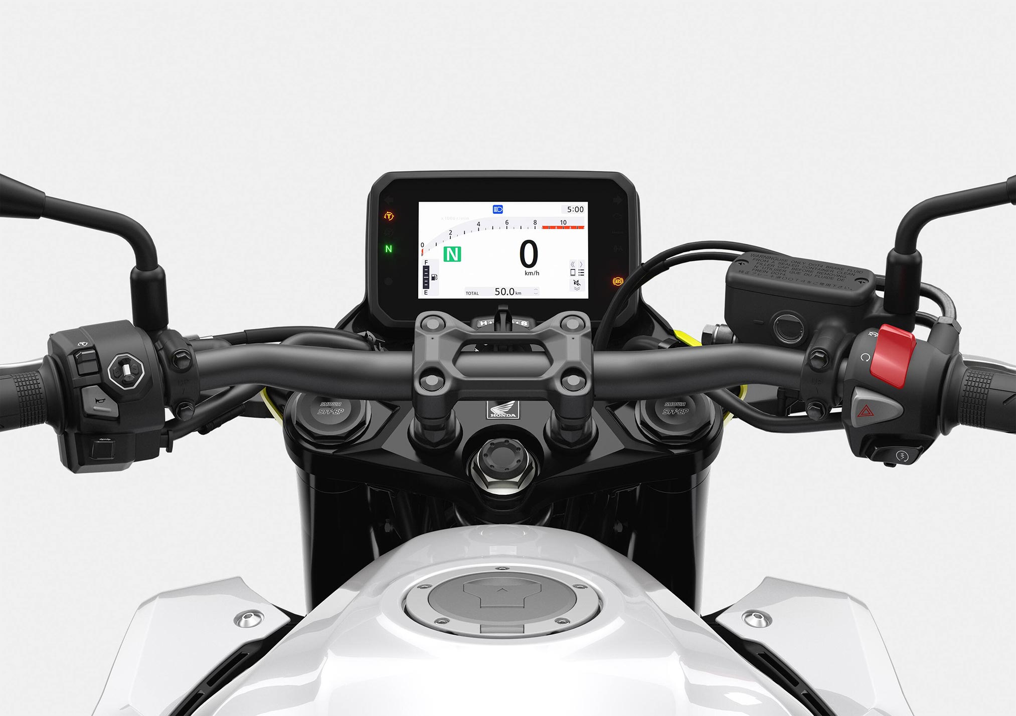 Premium technology, in the form of a five-inch full colour TFT screen inherited from the CB1000R, uses optical bonding to improve visibility in bright sunlight. By sealing the gap between the cover glass and TFT screen with resin, glare is reduced and backlight transmittance improved. It’s customisable between Bar, Circle and Simple display patterns and also offers the IOS/Android smartphone connectivity of Honda RoadSync.