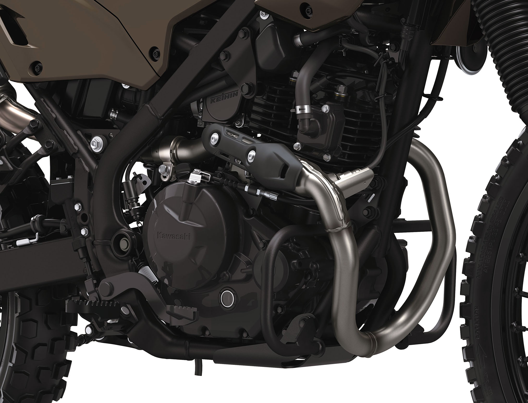 The KLX230 DF ABS earth-tone colors were chosen so that it doesn’t stand out when riding in both natural and urban areas. The body panels, engine, frame, swingarm, and other parts were all colored black to keep the look simple, tough, rugged and stealthy.