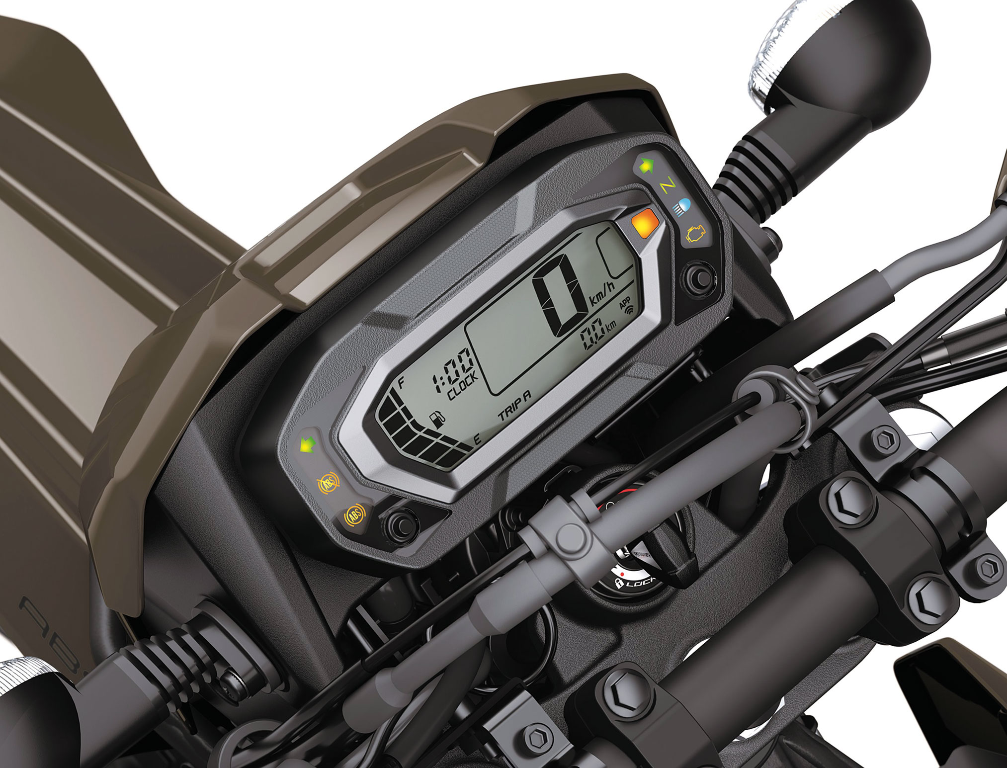 • The all-digital instrument panel provides smartphone connectivity to access instrument functions for an enhanced user experience. Display, features include speedometer, odometer, dual trip meters, fuel gauge, clock and indicator lamps.