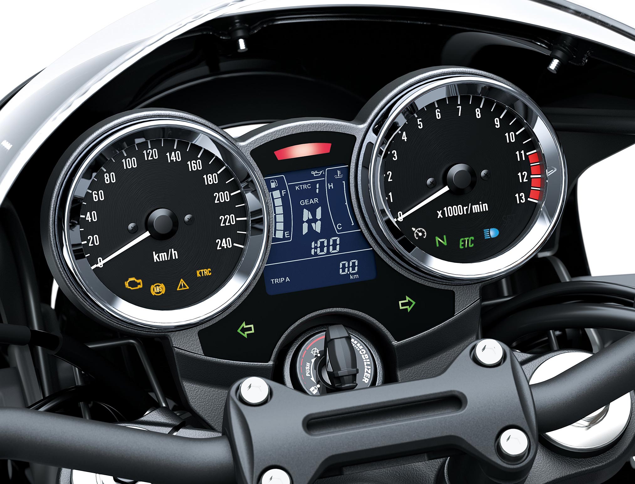 The set speed can be easily adjusted using the “+” and “-” buttons, while instinctive actions such as operating the brake, clutch, or rear brake pedal, closing the throttle past the zero-throttle position, or shifting into 1st or 2nd gear will disengage the system. Additionally, Electronic Cruise Control will automatically disengage if significant traction control intervention occurs, ensuring seamless integration with the Z900RS’ advanced riding technologies.
