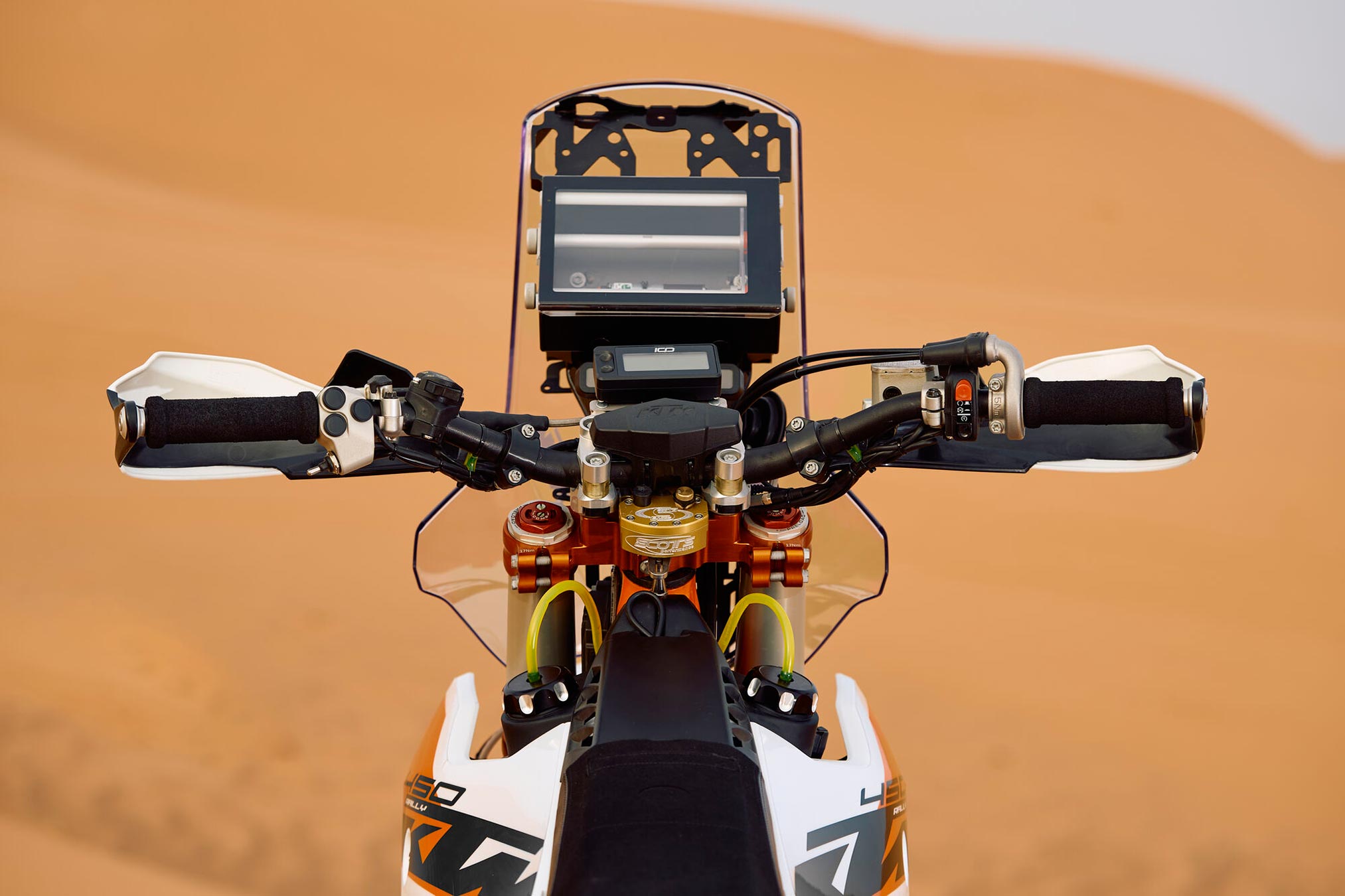 An 23 mm offset CNC machined triple clamps with a rally-specific design ensures optimal stiffness and precise handling when charging through the desert. This, together with an in-house developed PHDS system and the proven SCOTT’s steering damper, provides the confidence to keep it pinned in the faster, flowing rally stages.