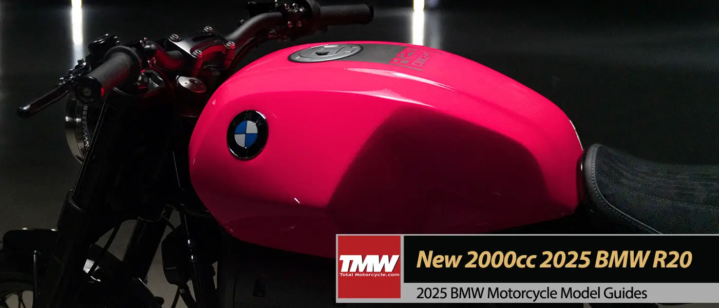 Just when you thought the 2024 BMW R18 1,802cc engine was big enough, for 2025 BMW not only increases the displacement to 2,000cc but also completely redeveloped the bike. The new 2025 BMW R20 presented at Concorso d’Eleganza Villa d’Este is featured in progressive color “hotter than pink” from the 1970´s and showcases an epitome of expressive and cool design, refined down to the last detail. Centered around the Big Boxer engine the 2025 BMW R20 is reduced to the essentials. Apart from the huge engine, the sculptured expressive tank stands apart from the completely redeveloped chrome-molybdenum steel tube that melds into the new two-arm variant chrome-molybdenum steel Paralever swingarm holding a big fat rear 200/55 tire. Radially mounted brake calipers and fully adjustable Öhlins Blackline components keep the massive presence under control. Above that one will notice the taillight has been perfectly integrated into the quilted black Alcantara and fine-grain leather single seat. Details are polished and anodized aluminum cylinder head covers, belt cover and air intake funnels complete the work.