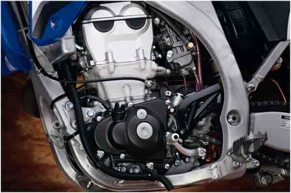 Revised liquid-cooled, 449cc, DOHC, 5-valve, 4-stroke, single with titanium valves delivers a broad power curve with a great over-rev capacity. Numerous improvements provide more low to mid rpm power and an improvement in overall powerful feeling.