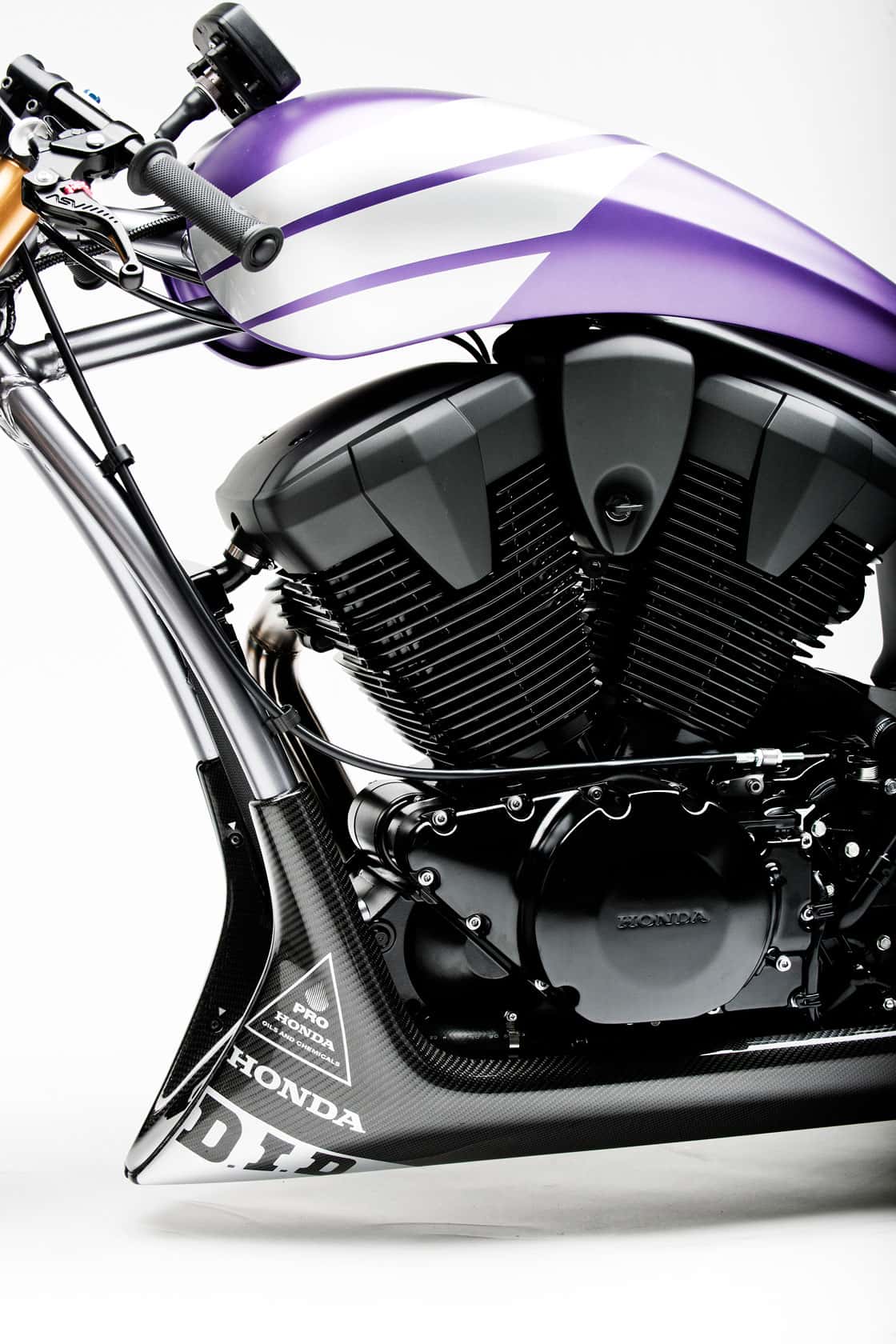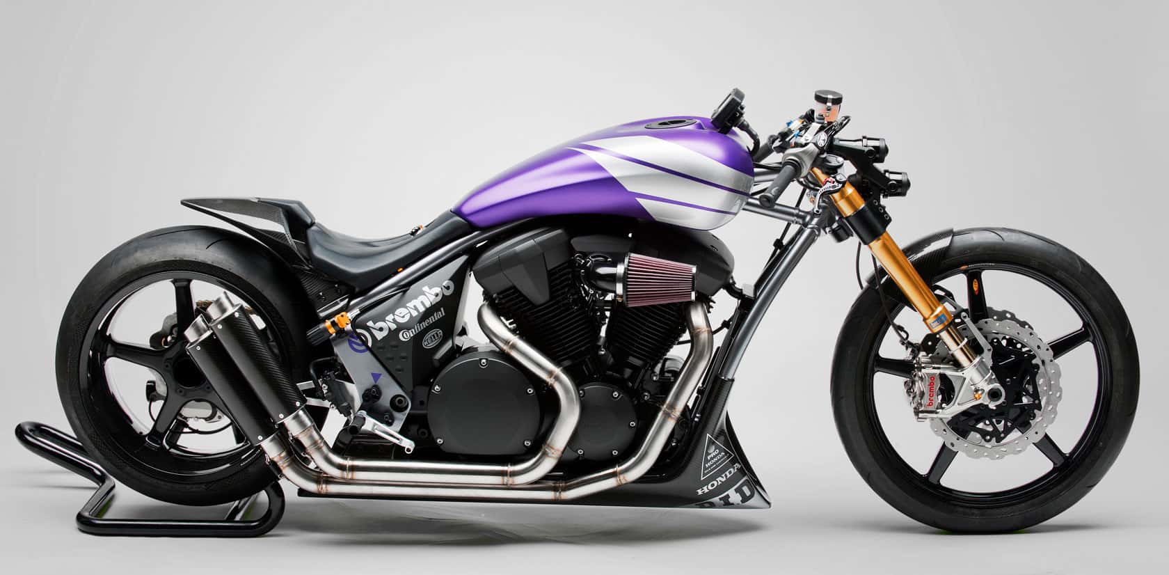Taking the 2010 Sabre, designer Edward Birtulescu (Honda R&D Americas) conceived Switchblade. A racing inspired cruiser that took styling cues from Formula1 and MotoGP. With one look you know that Switchblade is fully committed to precision and performance. Full Carbon fiber dress, racing 3 way adjustable suspension and a single sided swing arm with a 535 chain conversion optimize the single focus of this design, speed. Switchblade has a mass centralized proportion to reinforce this super sport assault.