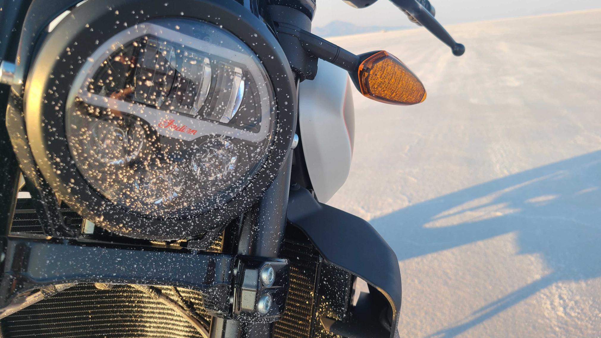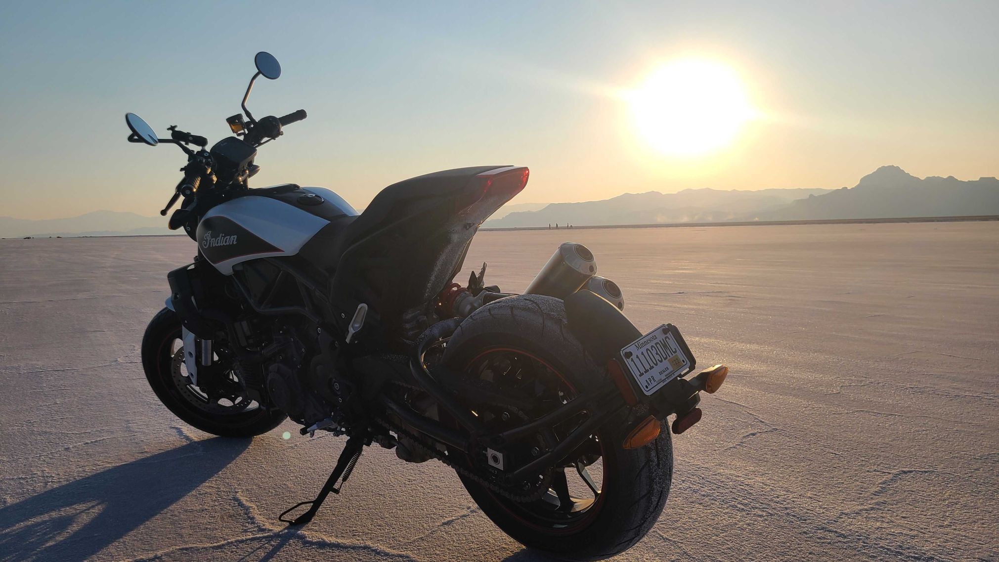 We knew when we took delivery of the 2022 Indian FTR-S that we wanted to get some time with it at Bonneville Salt Flats. We’re fortunate enough to live only two hours from the speedway, so we packed up on our last weekend with the bike and made the drive across Utah’s west desert. We didn’t do any timed runs or anything like that, just took the FTR-S out on the salt and stretched its legs. We also got some amazing photographs and footage. We took our motorhome too, so we could play all day and spend the night.