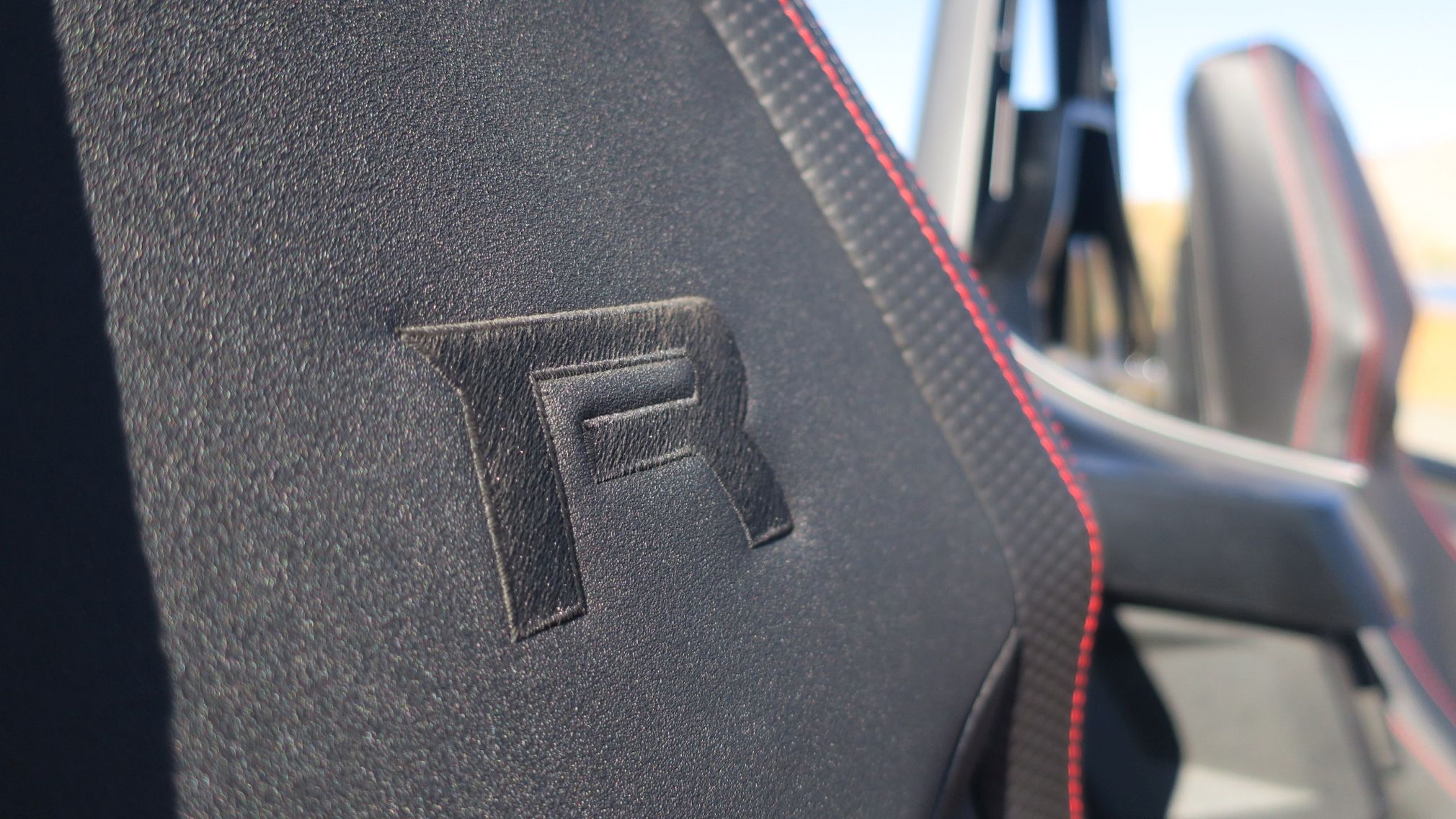 The small leather-wrapped steering wheel has a very sporty feel to it, accented by the flat bottom and big Slingshot emblem in the center. High contrast stitching on the steering wheel and seats further develop that edgy, sporty persona, and the big embroidered “R” on the headrest completes it.