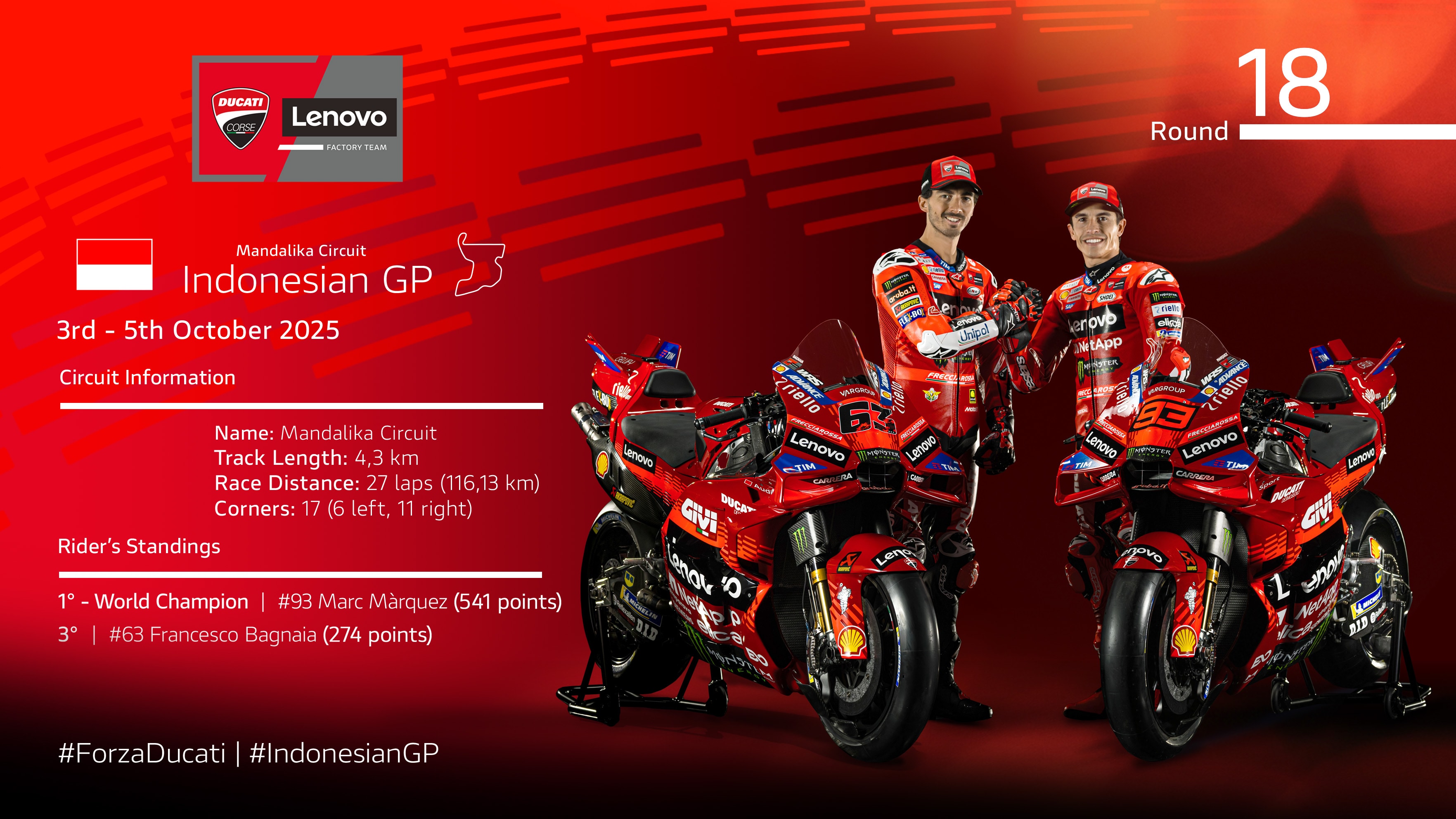 Less than 72 hours after clinching the title at Motegi, it’s already time to face Round 18 of the 2025 MotoGP season in Indonesia. Ducati and Marc Márquez are already the manufacturers’ and riders’ World Champions; they just need to seal the Triple Crown in the Premier Class, a goal that we already achieved in 2007 and 2022. Having missed out on the title by just two points at Motegi, the Ducati Lenovo Team will only need to maintain a lead of at least 309 points over Gresini Racing at the checkered flag of the Saturday’s SPRINT. The race will begin at 3:00 PM local time at the Mandalika Circuit, a track that made its debut on the calendar in 2022 and has seen the Desmosedici GP triumph twice (Bagnaia in ’23 and Martin in ’24).